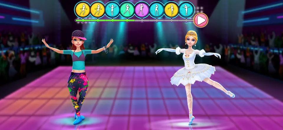 1. 双阵营选择:游戏首次启动时,玩家需选择加入芭蕾舞队伍或街舞团队。不同阵营拥有专属的舞蹈动作库与服装风格,芭蕾阵营强调优雅与古典韵味,穿着古典服饰,动作流畅;街舞阵营则突出动感与潮流,配合炫酷服饰,动作富有活力,带来差异化的玩法体验。