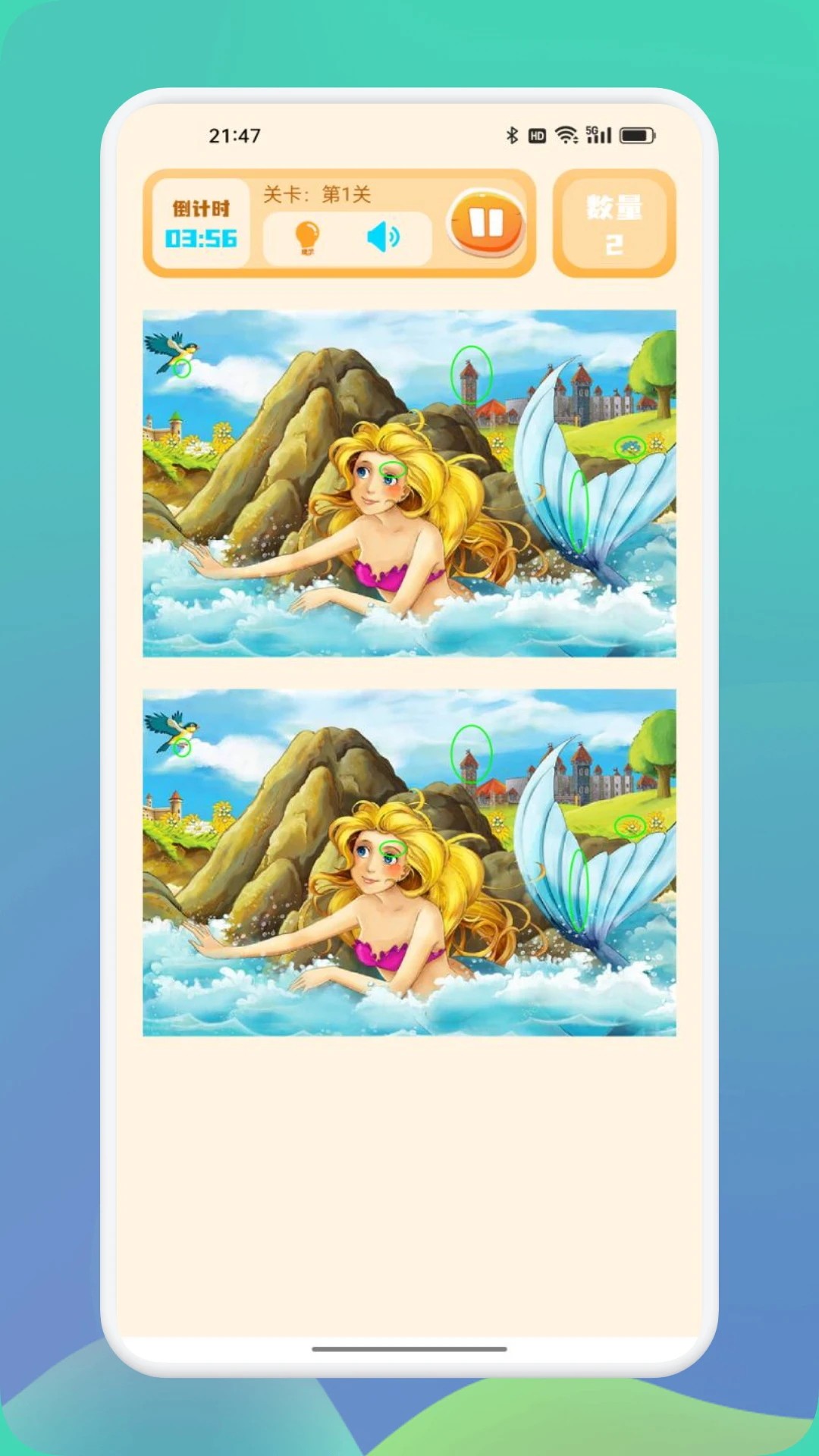 2. 弹性难度体系:前20关差异明显且位置固定,后续关卡则隐藏在边缘或重叠区域,最终关卡甚至需要识别3个动态变化的差异(例如随风摇曳的树叶)。